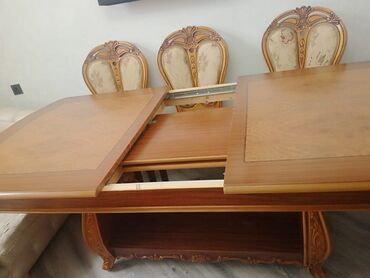 AçılanKlassik üslubda massiv taxta yemək otağı masası və 6 ədəd stul dəsti.
