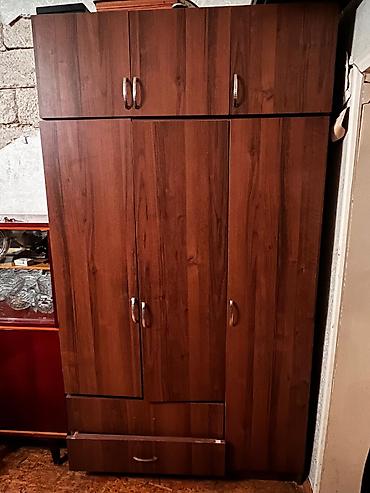 - Qarderob şkafı: tünd qəhvəyi rəng, çox bölməli dizayn. Üstdə ayrıca üst dolablar, ortada üç qapı, altda iki çekmece. Geyim, məişət ləvazimatları və tekstil üçün geniş saxlanma imkanı. Metal tutacaqlar, düz xətli fasad.