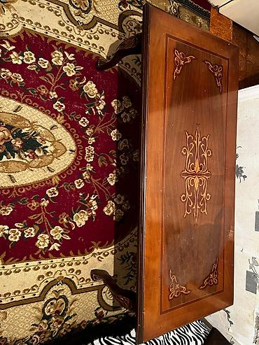 - Kiçik kofe/jurnal stolü: düzbucaqlı tabla, üzərində intarsiya/ornament naxışlı dekor, elegant qıvrılmış ayaqlar. Qonaq otağı üçün dekorativ və funksional.