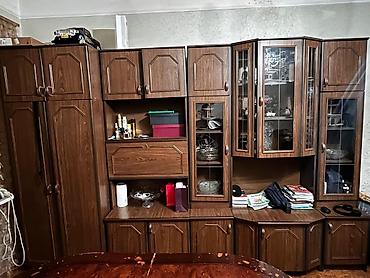 Təcili satılır. Qonaq otağı üçün bölməli divar mebeli - Material: taxta əsaslı laminat (taxta naxışlı), metal qollar - Rəng: tünd qoz - Kompozisiya: bir neçə hündür şkaf, şüşəli vitrin bölmələri, ...