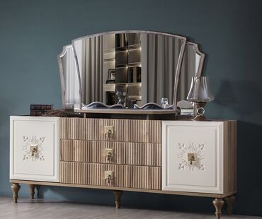 Klassik üslubda güzgülü konsol/komod - Rəng: krem (qızılı dekor elementləri ilə) - Material: laminat/MDF tipli səth, asan təmizlənən - Üst hissə: geniş düz masaüstü, bəzək və aksesuarlar üçün raha...