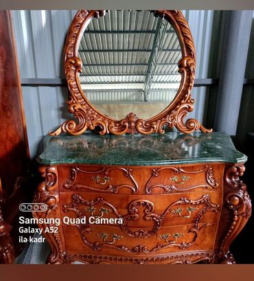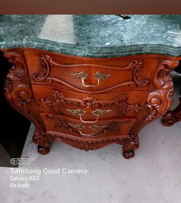 - Güzgülü komod: dalğalı forma, üç geniş çekmecə, antik tərzli metal tutacaqlar, kənarlarda dərin oymalar, barokko motivli ornamentlər.