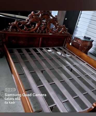 - Taxt çərçivəsi: başlıq və ayaq hissəsində həcmli oyma elementlər, bərk ağac korpus, dekorativ burma ayaqlar.