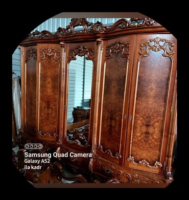 - 4 qapılı iri qarderob: yuxarı hissədə zəngin oyma tac, fasadda dekorativ panellər, metal açarlar, aşağıda rəflər/ç çekmecə zonası, hündür dekorativ ayaqlar.