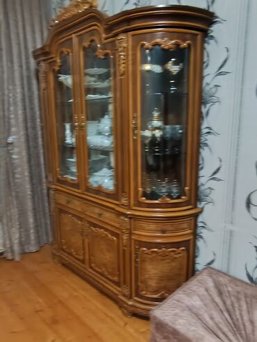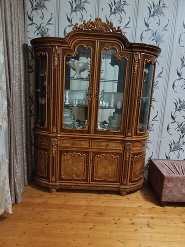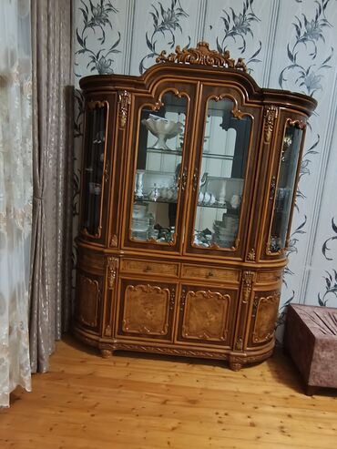 Klassik üslubda iri vitrinali bufet - Material: təbii ağacdan (oyma dekorlu), rəngi qoz tonlarında - Üst hissə: üç şüşəli vitrin bölməsi, hər bölmədə şüşə rəflər; yan tərəflərdə də şüşəli vitrində...