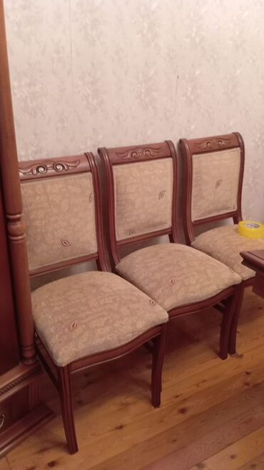 • 3 ədəd stul – yumşaq süngərli oturacaq və bel hissəsi, naxışlı parçayla üzlük, taxta karkas