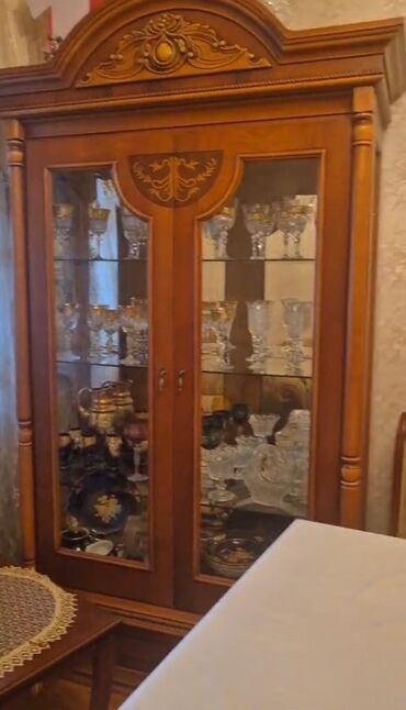 • Şüşə vitrin şkaf – iki qapılı, güzgülü arxa panel və şüşə rəflərlə, oyma başlıq