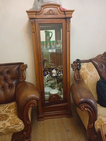 - Material: Təbii ağac karkas, şüşə vitrin qapıları; yumşaq hissələrdə qalın dəri tipli üzlük və naxışlı parça