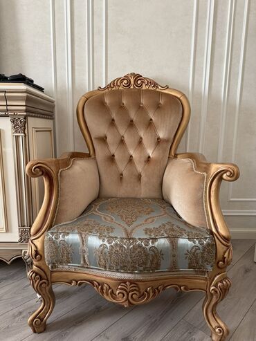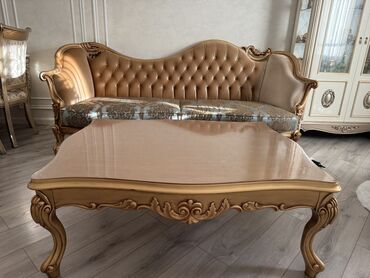 Klassik üslubda qonaq otağı mebel dəsti Komplektin tərkibi: - 1 ədəd üçnəfərlik divan – kapitone işləməli, qızılı dekorlu başlıq, qıvrım formalı taxta ayaqlar - 2 ədəd kreslo – divanla eyni üslub,...