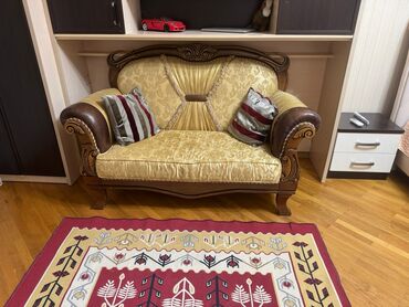 - Qollarda və karkasda qəhvəyi tonlarda massiv ağac elementlər, oyma naxışlı başlıqlar
