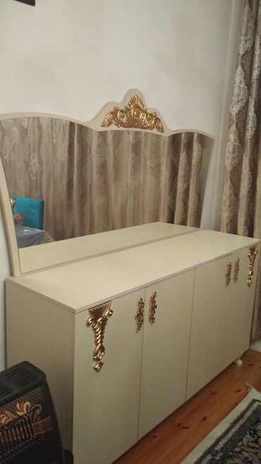 Klassik üslubda krem rəngli mebel dəsti - Şkaf: İkiqat şüşəli qapı, aşağıda iki geniş siyirmə. Qızılı dekorativ kənarlar, metal ornamentli tutacaqlar, təkərli ayaqlar. - Konsol-güzgü: Dalğalı form...