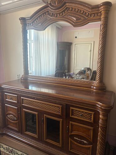 - Böyük bufet-konsol güzgü ilə – kütləvi taxta konstruksiya, oyma dekor, üst hissədə iri dekorativ çərçivəli güzgü; aşağıda bir neçə çekmece və qapılı bölmələr.