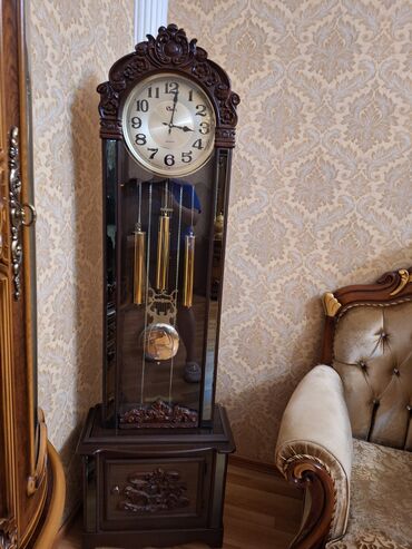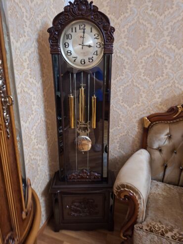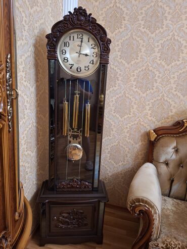 Klassik üslubda pendulumlu “grandfather” döşəmə saatı. - Korpus: qırmızı-qəhvəyi massiv ağac görünüşlü, oyma dekor elementləri, tağ formalı üst hissə. - Siferblat: qızılı tonlarda ornamentli, 1–12...