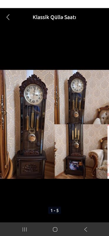 S⁰⁴Saat 230azn Ünvan Savxoz ramana⁵³¹⁶ Məhsul təsviri: - Klassik dizaynlı mərmər-qəhvəyi rəng tonlarında iri döşəmə saatı (grandfather clock). - Üst hissədə oyma naxışlı taxta korpus, ön tərəfi şü...