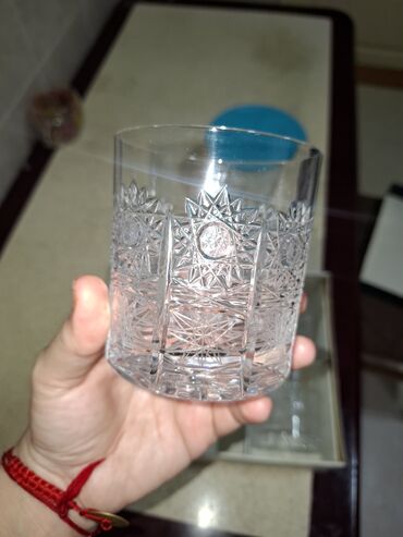 - Şüşə qədəh dəsti: 6 ədəd, orijinal qutuda. Aşağı, silindrik formalı, kəpənək/kristal üslubunda dərin oyma naxışlı, bərq vuran şəffaf şüşə. Viski, likör və ya soyuq içkilər üçün ideal, eyni dizayn seriyalı.