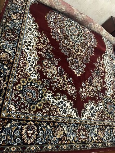 Xalça – klassik Şərq üslubunda - Rənglər: əsas sahə tünd qırmızı/bordo, krem və bej tonlarında mərkəzi medalyon, qara, mavi və qızılı çalarlarla zəngin naxışlar - Dizayn: mərkəzi medalyon, çoxqat ...