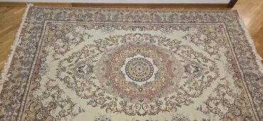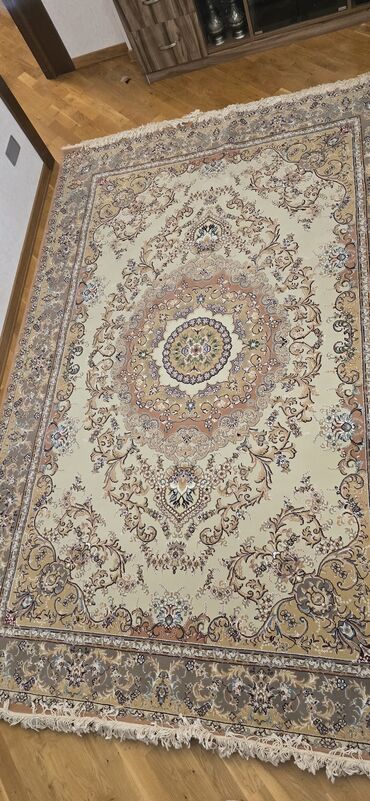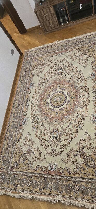 Xalça – klassik naxışlı, saçaqlı - Ölçü: təxmini 2 x 3 m (şəkillərə əsasən iri ölçülü) - Rəng palitrası: krem əsas fon, toz-çəhrayı və açıq mavi detallarla bəzədilmiş klassik floral-oriental ornam...