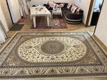 - Forma və ölçü: düzbucaqlı, iri ölçülü (geniş qonaq otağı üçün uyğun; fotolarda parket üzərində tam sahəni tutur)
