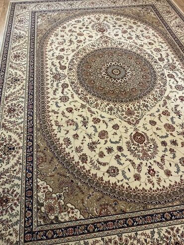 - Ornament: mərkəzdə detallı medalyon, ətrafında gül-çəçək motivləri, çoxqatlı haşiyə (tünd mavi gül kəməri, bej və krem keçidlər)