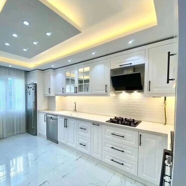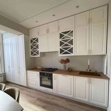 - Üst və alt dolablar: ağ rəngli klassik frezalı fasadlar, dekorativ şüşəli vitrin qapılar, qızılı və ya qara rəngdə tutacaqlar
