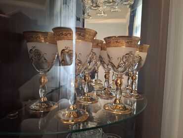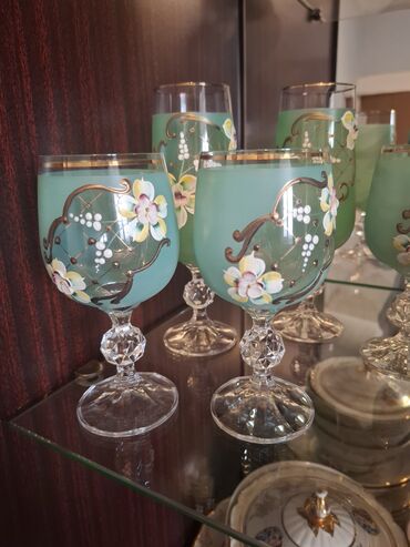- Yaşıl mat şüşədən dekorativ qədəhlər – əl işı kimi görünən çiçək rəsmləri, qızılı xətlər və fasetli kristal ayaq.