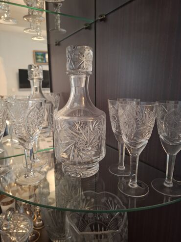 - Kəsimli kristal sürahi və uyğun kiçik qədəhlər – qalın dib, qabartma ulduz və yarpaq motivləri, eyni dizaynlı qapaqla.