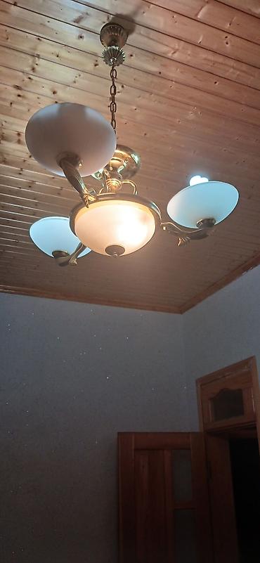 Asma çilçıraq – klassik/retro dizayn, latundan 1967 il - Material: metal karkas (qızılı rəngdə), dairəvi açma-naqişli dekorativ kəmər, şüşə/kristal asqılar - Forma: dairəvi korpus, mərkəzdən çıxan...