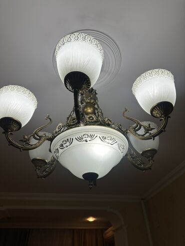- Material: tökmə metal (antik bürünc tonlarda) karkas, mat naxışlı şüşə plafonlar