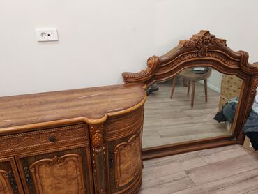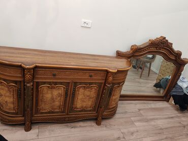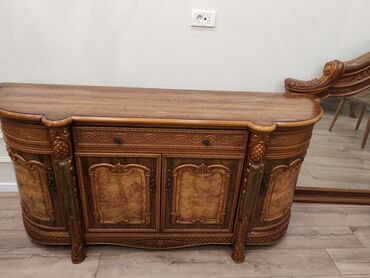 Klassik üslubda taxtadan hazırlanmış mebel dəsti Tərkibi: - Geniş güzgülü konsol/komod: üstü naxışlı çərçivəli böyük güzgü, ön və yanlarda oyma dekor, mərkəzdə çekmece, aşağı hissədə 2 qapılı bölm...