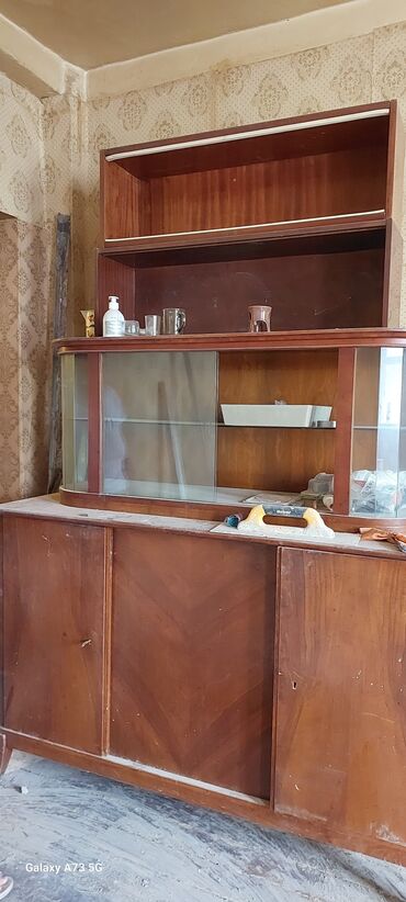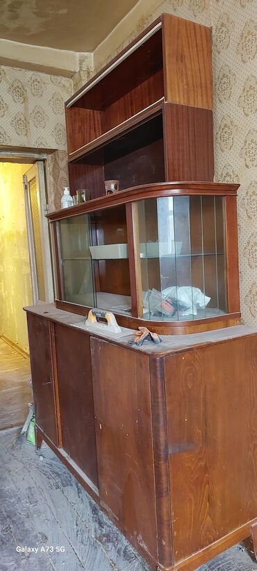 - Orta vitrin: ön tərəfi sürüşən şüşə qapılar, içəridə şüşə rəf; kolleksiya və servis dəstlərinin nümayişi üçün