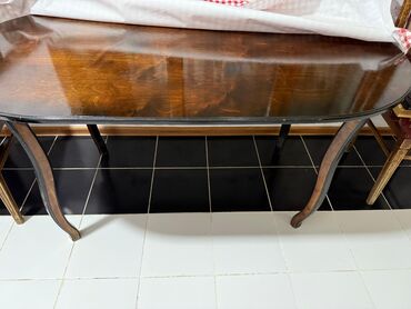 Stol–stul dəsti - Klassik üslubda taxta yemək masası: oval formalı, tünd qırmızı/qəhvəyi rəng, laklı parlaq səth, yumru kənarlar. - Masaya uyğun taxta stullar: yumşaq oturacaq və bel hissəsi, elas...