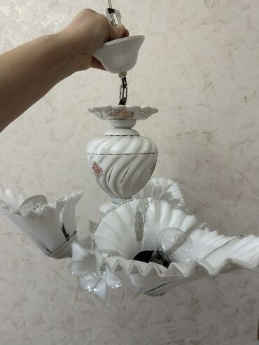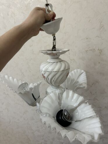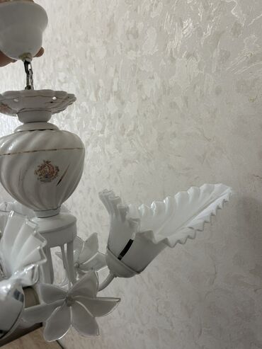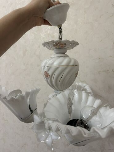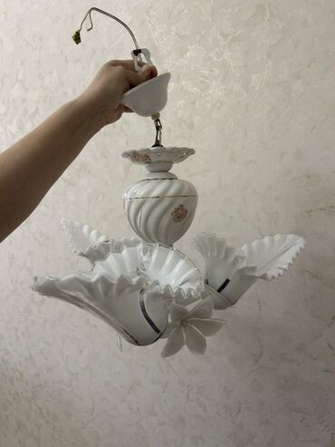 Klassik üslubda 3 qollu asma çilçıraq. - Material: metal karkas (qızılı ton), mərkəzdə dekorativ tünd rəngli elementlər - Kiplər: 3 ədəd mat ağ şüşə plafon, ləçək forması - Patron növü: standart v...