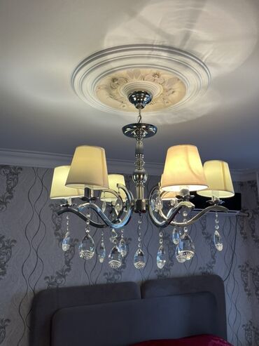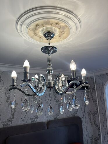 Zərif xrom detallar və parlaq kristal asqılar interyerə dəbdəbəli görünüş verir, dekorativ işıq kölgələri yaradır. E14 LED və ya halogen lampalarla işləyir. Klassik tavan rozetkası ilə harmonik görünüş.