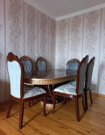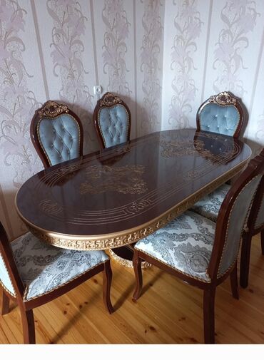 Detallar: Zərif oyma naxışlar, parlaq masaüstü və zəncirvari qızılı haşiyələr dəstə zəngin görünüş verir. Rahat oturuş və dayanıqlı konstruksiya.