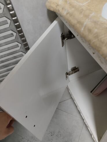 - Üst stolüstü: təbii mərməri xatırladan bej rəngli parlaq səth, yumşaq oval lavabo ilə birgə. Kenarlarında dekorativ relyef işləmələr.