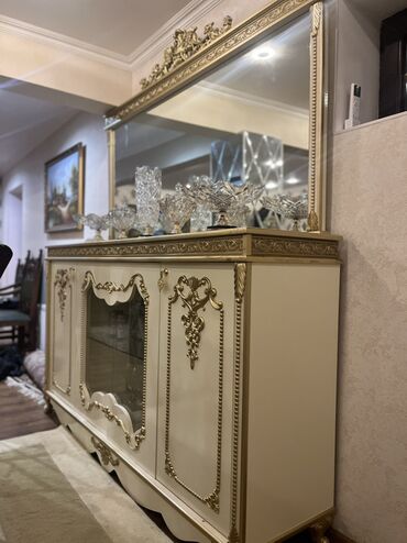 - Komplekt: aşağı hissədə üç qapılı dolab + mərkəzdə şüşəli vitrin rəfləri; üst hissədə iri dekorativ güzgü