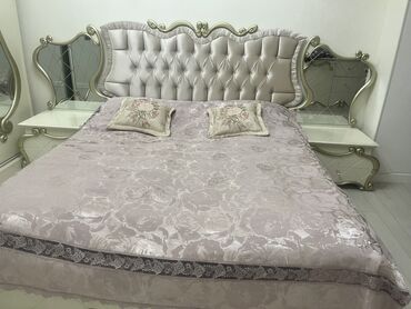 - Geniş ikinəfərlik çarpayı: yumşaq, kapitone başlıq, zərif qızılı haşiyələr, dekorativ kənar işləmələr. Başlığa inteqrasiya olunmuş güzgü panelləri və iki ədəd tumbi (üstü parlaq səthli).