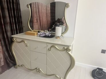 - Paltar stolu/komod: parlaq ağ üst səth, ortada 3 geniş çəkməcə, yanlarda dekorativ qapılar; üstündə iri, fiqurlu güzgü. Qızılı barokko tipli ornamentlər ilə.