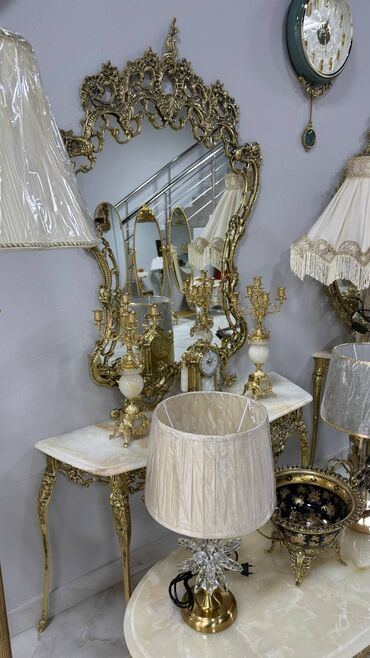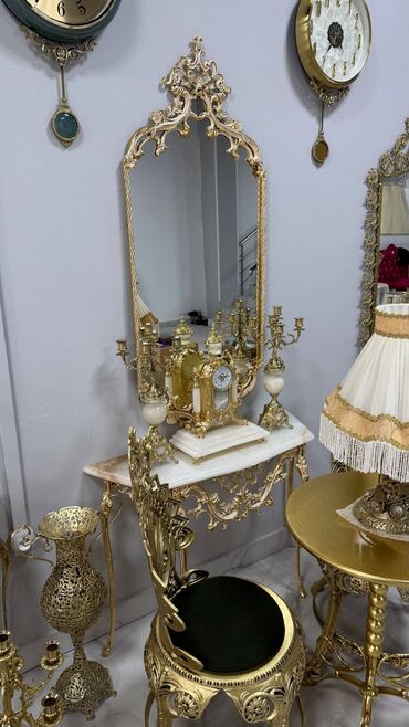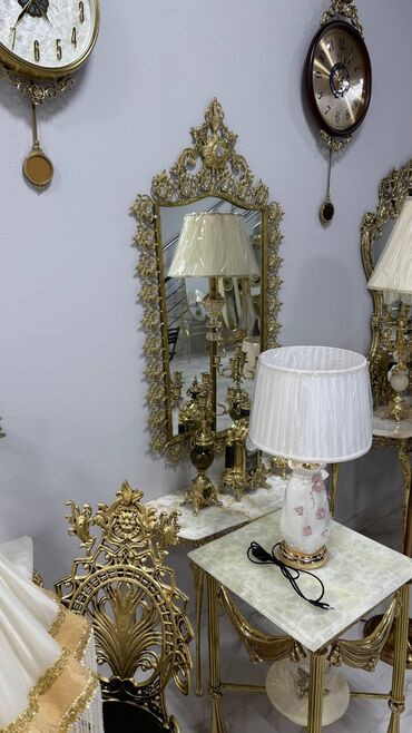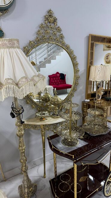 - Zərif oyma naxışlı, qızılı tonlarda metal çərçivələrə sahib müxtəlif formalı (oval, düzbucaqlı, iri və dar) güzgülər