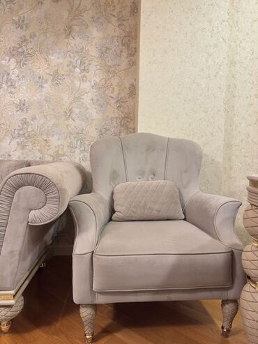 - Dizayn: klassik-royal stil, bükülü qol dayaqları, kapitone tipli vurğular, qızılı haşiyələr; divan və kreslolar eyni stilistikada.
