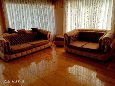 Dəst mebel: 3 nəfərlik divan + 2 ədəd kreslo - Rəng: açıq bej və qızılı şokolad tonlarının kombinasiyası - Parça: yumşaq, naxışlı məxməri/parça üzlük - Dizayn: enli, qıvrım formalı qol dayaqları; ...
