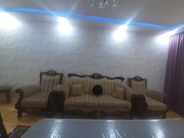 Klassik üslubda salon dəsti - Tərkib: 3 nəfərlik divan + 2 böyük kreslo (şəkillərdə) - Rəng: bej tonlarında, üzərində zərif naxışlı parça - Dizayn: qalın, yumşaq oturacaq və bel hissəsi; geniş, ya...