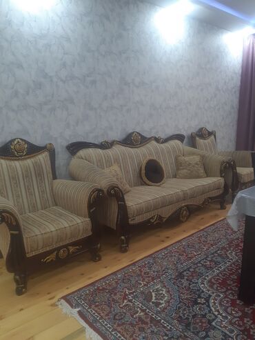Klassik üslubda dəst mebel - Tərkibi: 3 nəfərlik salon divanı, 1 ədəd kreslo, şüşə üstlü orta stol. - Üslub: barok/klassik, dekorativ qızılı oyma taxta karkas və ayaqlar. - Parça: zərif naxışlı at...