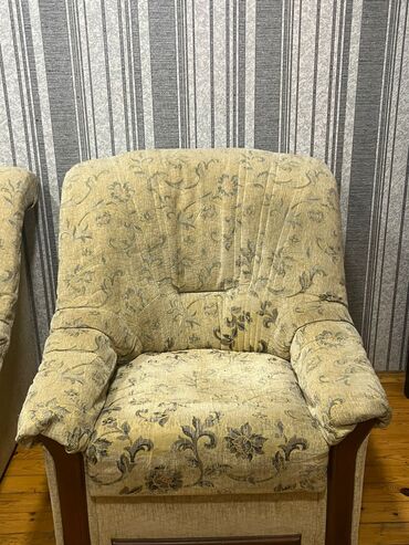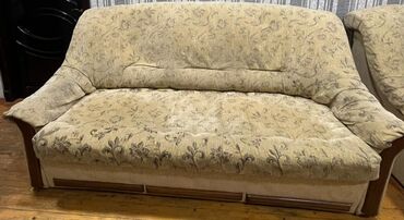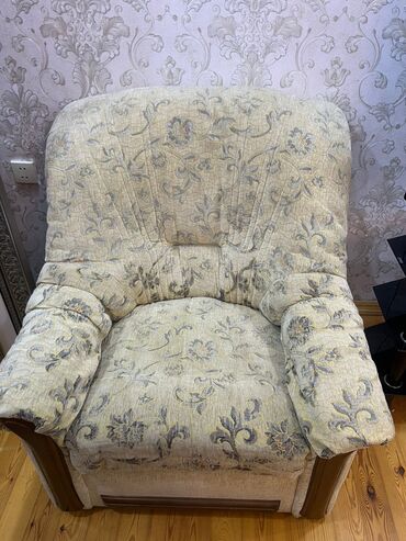 Mebel dəsti: 3 nəfərlik divan + 1 nəfərlik 2 ədəd kreslo - Rəng: bej/qəhvəyi tonlarda - Parça: naxışlı, klassik ornamentli döşəmə - Divan: yüksək bel hissəsi, yumşaq oturacaq yastıqları, yan qol ...