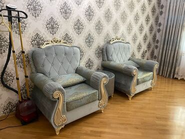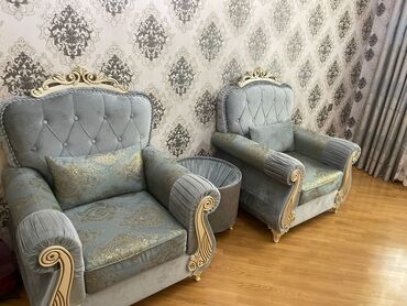 Klassik üslubda yumşaq mebel dəsti - 2 ədəd geniş, dərin oturacaqlı kreslo - 1 ədəd dairəvi köməkçi masa/puf – üzərində şüşə masaüstü, altı qızılı rəngli ayaqlar - Kresloların materialı: zərif tox...