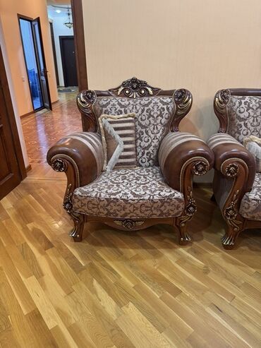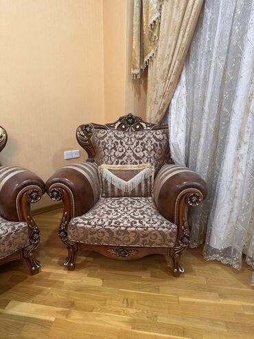Klassik üslubda oturma dəsti - Tərkibi: 2 nəfərlik divan + 2 ədəd iri kreslo + taxta orta stol - Üslub: klassik/barokko motivli oyma detallar, qızılı naxışlı parça, tünd qəhvəyi massiv ağac karkas...