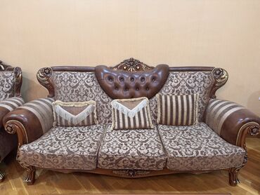 Klassik üslubda mebel dəsti Embawood dan alınıb - Tərkib: 3-4 nəfərlik divan, 2 ədəd kreslo - Dizayn: Qəhvəyi-bej zolaqlı və naxışlı parça, tünd qoz rəngli bərk ağac karkas - Bəzək: Oyma taxta el...