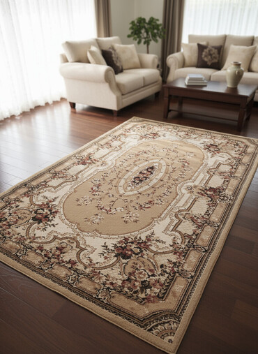 - Rənglər: açıq bej, krem, qızılı və qəhvəyi tonlar; mərkəzdə oval medalyon, ətrafında gül naxışları və dekorativ haşiyə.