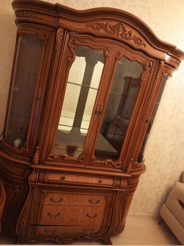 Klassik üslubda qonaq otağı dəsti Dəst tərkibi: - Böyük vitrin şkaf: ön və yanları şüşəli, iç-içə rəflər, dekorativ oyma elementlər, 4 alt qapı və 4 üst çekmece. Serviz və biblolar üçün ideal eksp...
