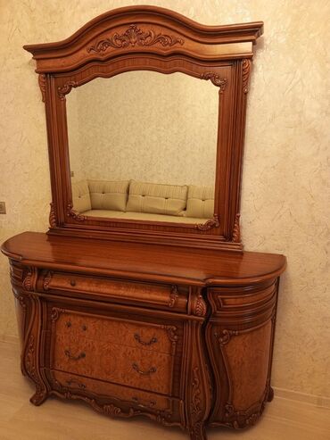 Klassik üslubda taxtadan hazırlanmış mebel dəsti Tərkibi: - Geniş güzgülü konsol/komod: üstü naxışlı çərçivəli böyük güzgü, ön və yanlarda oyma dekor, mərkəzdə çekmece, aşağı hissədə 2 qapılı bölm...